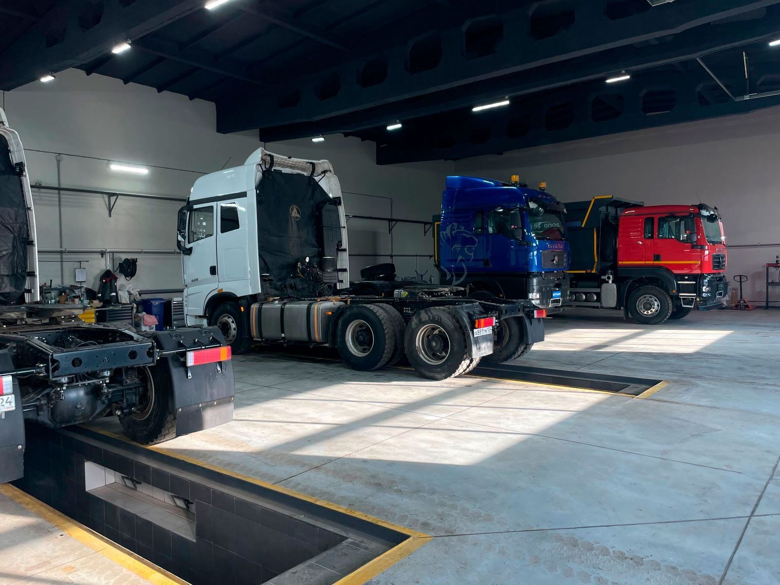 - На территории сервисного центра предусмотрены зона отдыха, зона длительного ожидания, душевая, прачечная, кухня, грузовая автомойка.